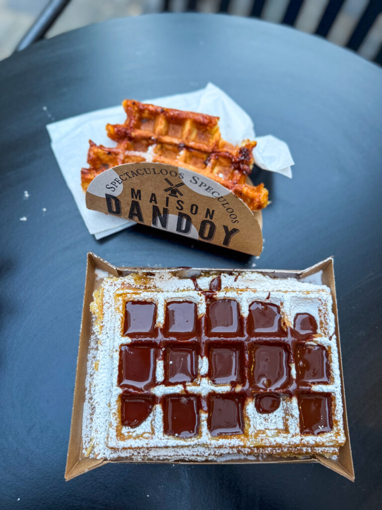 Another Belgian classic are the waffles! There are two types the: Brussels waffle and the Liege waffle. The Brussels waffles are light and fluffy, while the Liege waffles are denser, sweeter, and chewier. They can be found all over the city, but I was told that the best ones are found at Maison Dandoy, so that’s where I went, and while I intended to only try to Liege waffle, I ended up with both.